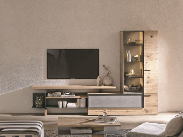 Voglauer Wohnwand Meran Wildeiche furniert Akzent Zementgrau gespachtelt Stellmae ca.